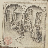 Parigi, Bibliothèque Nationale de France, Fr. 25528, f. 13v. Il copista del manoscritto è Pierre d'Amboise. Pandaro si reca da Criseide per corteggiare la fanciulla al posto dell'amico.