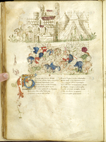 New York, Pierpont Morgan Library, M 371, f. 26v. Il copista del manoscritto, datato ottobre 1414, è Pace di Giuliano da Olibano. L'esercito greco e l'esercito troiano si affrontano in battaglia sotto le mura di Troia.