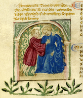 New York, Pierpont Morgan Library, M 371, f. 34v. Il copista del manoscritto, datato ottobre 1414, è Pace di Giuliano da Olibano. Troiolo conversa con Pandaro ed un altro giovane troiano.