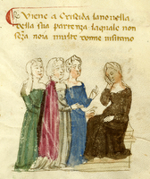 New York, Pierpont Morgan Library, M 371, f. 32r. Il copista del manoscritto, datato ottobre 1414, è Pace di Giuliano da Olibano. Tre dame tentano di consolare Criseide.