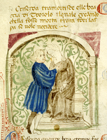 New York, Pierpont Morgan Library, M 371, f. 19v. Il copista del manoscritto, datato ottobre 1414, è Pace di Giuliano da Olibano. Pandaro conferisce con Troiolo; Troiolo si trova da solo.