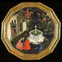 Milano, Pinacoteca del Castello Sforzesco, inv. n. 1347/15. Griselda dà alla luce un figlio maschio, assistita da tre donne; all'esterno, Gualtieri è impegnato in una partita ad un gioco da tavolo con un cortigiano.