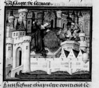 Parigi, Bibliothèque Nationale de France, Fr. 235, f. 60v. Sardanapalo si getta nel rogo del palazzo con i suoi tesori; all'esterno delle mura si trova l'esercito degli assedianti.