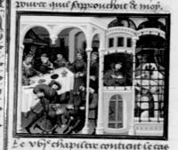 Parigi, Bibliothèque Nationale de France, Fr. 235, f. 67r. Durante un banchetto Nabucodonosor fa massacrare i figli di Sedecia sotto gli occhi del padre; il giovane Sedecia rinchiuso in prigione; l'anziano Sedecia sul letto di morte, assistito da un sacerdote.