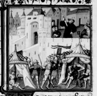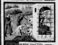 Parigi, Bibliothèque Nationale de France, Fr. 235, f. 122v. Malco fa impiccare suo figlio, il vescovo Cartalone; Malco viene assassinato (?).