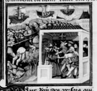 Parigi, Bibliothèque Nationale de France, Fr. 235, f. 124r. Annone, con le mani mozzate, viene giustiziato dinanzi alla folla.