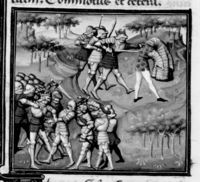 Parigi, Bibliothèque Nationale de France, Fr. 235, f. 144v. Durante lo scontro tra due eserciti a cavallo Alessandro I, re dell'Epiro, viene trafitto da un soldato con una lancia mentre tenta di guadare il fiume Acheronte.