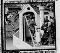 Parigi, Bibliothèque Nationale de France, Fr. 235, f. 135v. L'autore Giovanni Boccaccio, seduto dinanzi ad un leggio, rimprovera un gruppo di uomini.