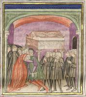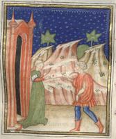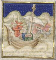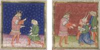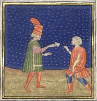 Kassel, Universitätsbibliothek Kassel, Landesbibliothek und Murhardsche Bibliothek der Stadt Kassel, 2° poet. et roman. 3, f. 89v. Due messaggeri inviati dal re parlano con due mercanti sulla loro nave, mentre un servitore li attende a riva con i cavalli.