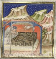 Kassel, Universitätsbibliothek Kassel, Landesbibliothek und Murhardsche Bibliothek der Stadt Kassel, 2° poet. et roman. 3, f. 75v. Florio, addormentato nel suo letto, sogna una figura alata dalle vesti regali con un arco e due frecce, seduta su due aquile e due leoni, ai cui lati compaiono una fanciulla inginocchiata ed una nave sorpresa dalla tempesta nell'atto di naufragare.