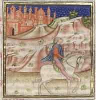 Kassel, Universitätsbibliothek Kassel, Landesbibliothek und Murhardsche Bibliothek der Stadt Kassel, 2° poet. et roman. 3, f. 88v. La dea Diana appare al re Felice durante una battuta di caccia al cervo.