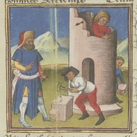 Parigi, Bibliothèque Nationale de France, Fr. 229, f. 6r. Il copista del manoscritto è Boniface de Remenant. Nembrot sovrintende alla costruzione della Torre di Babele.