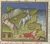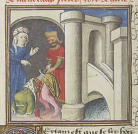 Parigi, Bibliothèque Nationale de France, Fr. 229, f. 14r. Il copista del manoscritto è Boniface de Remenant. Edipo uccide suo padre Laio in battaglia; la regina Giocasta compie il suicidio trafiggendosi con la spada.