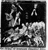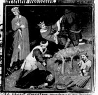 Parigi, Bibliothèque Nationale de France, Fr. 226, f. 267v. Filippo il Bello viene sbranato da un cinghiale durante una battuta di caccia.