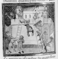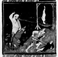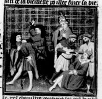 Parigi, Bibliothèque Nationale de France, Fr. 226, f. 268v. Tre uomini vengono uccisi per ordine di Gualtieri di Brienne, duca d'Atene.