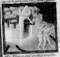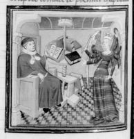 Parigi, Bibliothèque Nationale de France, Fr. 228, f. 9v. Adamo ed Eva compaiono dinanzi all'autore Giovanni Boccaccio, seduto nel suo studio.