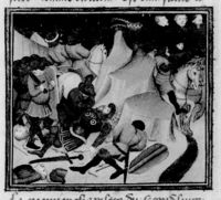 Parigi, Bibliothèque Nationale de France, Fr. 226, f. 260r. Guido di Lusignano e i suoi soldati fuggono inseguiti dall'esercito del Saladino.
