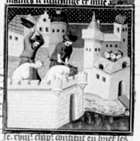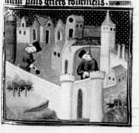 Parigi, Bibliothèque Nationale de France, Fr. 226, f. 256r. Diogene viene sconfitto in battaglia; Belzet monta a cavallo usando la schiena di Diogene come predellino.