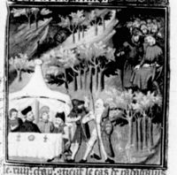 Parigi, Bibliothèque Nationale de France, Fr. 226, f. 231r. Le truppe di Stilicone celebrano durante un banchetto nel loro accampamento, mentre Radagaiso e i suoi uomini rimangono affamati.