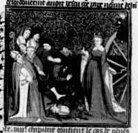 Parigi, Bibliothèque Nationale de France, Fr. 226, f. 224r. In seguito al suicidio del fratello Magnenzio, trafittosi con un pugnale, Decenzio si impicca in un palazzo.