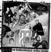 Parigi, Bibliothèque Nationale de France, Fr. 226, f. 256v. La battaglia di Tinchebray tra gli eserciti di Enrico I d'Inghilterra e Roberto II di Normandia.
