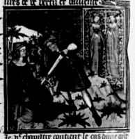 Parigi, Bibliothèque Nationale de France, Fr. 226, f. 150r. Re Gripo, seduto sul trono, ordina a due soldati di uccidere Alessandro Zebenna.
