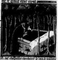 Parigi, Bibliothèque Nationale de France, Fr. 226, f. 127r. Deidamia, rifugiatasi nel tempio di Diana, viene raggiunta da Milone e uccisa.