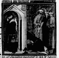 Parigi, Bibliothèque Nationale de France, Fr. 226, f. 114r. Uno dei giovani figli di Alessandro viene assassinato insieme a sua madre.