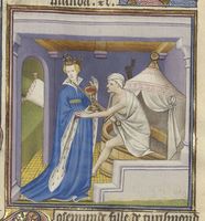 Parigi, Bibliothèque de l'Arsenal, 5193, f. 354v. Lo scudiero Elmichi, armato di spada, offre una coppa di veleno alla regina Rosmunda mentre esce dal bagno.