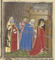 Parigi, Bibliothèque de l'Arsenal, 5193, f. 370r. Carlo Magno fa imprigionare Desiderio, re dei Longobardi, insieme alla sua famiglia.