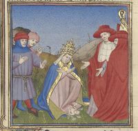 Parigi, Bibliothèque de l'Arsenal, 5193, f. 333r. Giuliano l'Apostata viene trafitto alle spalle da Mercurio.