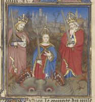 Parigi, Bibliothèque de l'Arsenal, 5193, f. 247v. Orode, re dei Parti, abdica cedendo la corona al figlio Fraate.