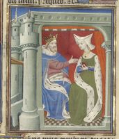 Parigi, Bibliothèque de l'Arsenal, 5193, f. 130v. Evagorace re di Cipro, Teo re d'Egitto e Aminta re di Macedonia in atteggiamento dolente.