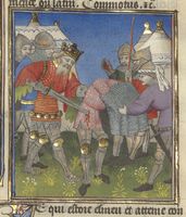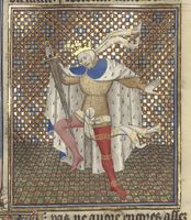 Parigi, Bibliothèque de l'Arsenal, 5193, f. 102r. Cambise si trafigge la coscia con la spada.