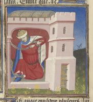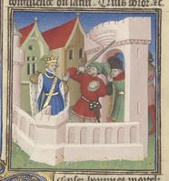 Parigi, Bibliothèque de l'Arsenal, 5193, f. 93v. Lucio Tarquinio uccide Servio Tullio alle porte della città.