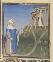 Parigi, Bibliothèque de l'Arsenal, 5193, f. 88r. La Povertà, rappresentata come una vecchia vestita di stracci, lotta con la Fortuna, una regina alata; la Sfortuna, raffigurata come un uomo nudo, legata ad un palo.