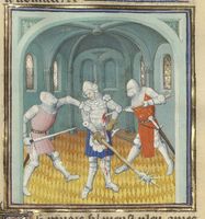 Parigi, Bibliothèque de l'Arsenal, 5193, f. 140v. Clearco, tiranno di Eraclea, viene assassinato da due soldati.