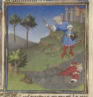 Parigi, Bibliothèque de l'Arsenal, 5193, f. 118r. I ciclopi vengono cacciati dalla Sicilia da un gruppo di uomini armati.