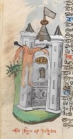 Londra, British Library, Harley 1766, f. 204v. Arbogaste impicca l'imperatore Valentiniano (erroneamente indicato come «Maximus») ad una torre.