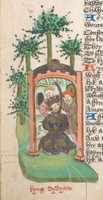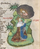 Londra, British Library, Harley 1766, f. 217r. Re Artù, seduto sul trono, riceve una lettera da due messi romani.