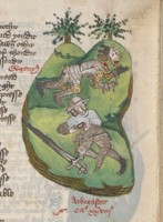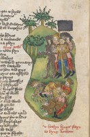 Londra, British Library, Harley 1766, f. 218r. Re Artù e tre cavalieri uccidono i re pagani.