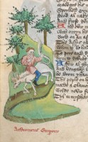 Londra, British Library, Harley 1766, f. 209r. Un uomo taglia un braccio ad Attalo.