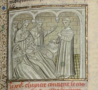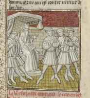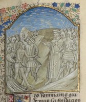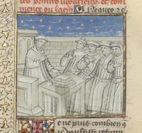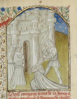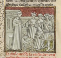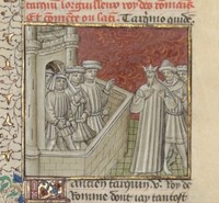 Parigi, Bibliothèque interuniversitaire Sainte-Geneviève, 1128, f. 59r. Ciro accetta la resa di Astiage dopo averlo sconfitto in battaglia.