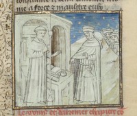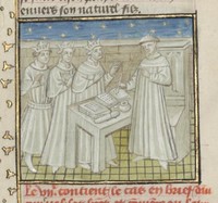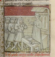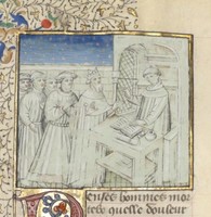 Parigi, Bibliothèque interuniversitaire Sainte-Geneviève, 1128, f. 47v. Giovanni Boccaccio incontra alcuni Ebrei.