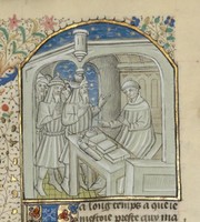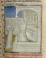 Parigi, Bibliothèque interuniversitaire Sainte-Geneviève, 1128, f. 71v. Barat compare dinanzi a Giovanni Boccaccio; sullo sfondo sono due spettatori.