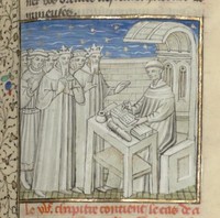 Parigi, Bibliothèque interuniversitaire Sainte-Geneviève, 1128, f. 44v. Giovanni Boccaccio incontra tre sovrani.