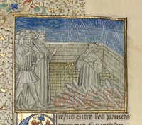 Parigi, Bibliothèque interuniversitaire Sainte-Geneviève, 1128, f. 65r. Creso, condannato al rogo da Ciro, viene salvato dalla pioggia che spegne le fiamme.