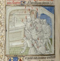 Parigi, Bibliothèque interuniversitaire Sainte-Geneviève, 1128, f. 56v. Sedecia assiste al massacro dei propri figli ordinato da Nabucodonosor.