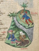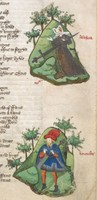 Londra, British Library, Harley 1766, f. 83r. Tre donne della Tracia colpiscono Orfeo. Due volpi con le code annodate ad una torcia accesa; Sansone uccide i Filistei con la mandibola di un asino; Sansone scardina la porta della città di Gaza.