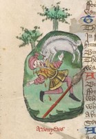 Londra, British Library, Harley 1766, f. 63v. Atalanta uccide il cinghiale calidonio con una freccia; Meleagro uccide i suoi due zii.